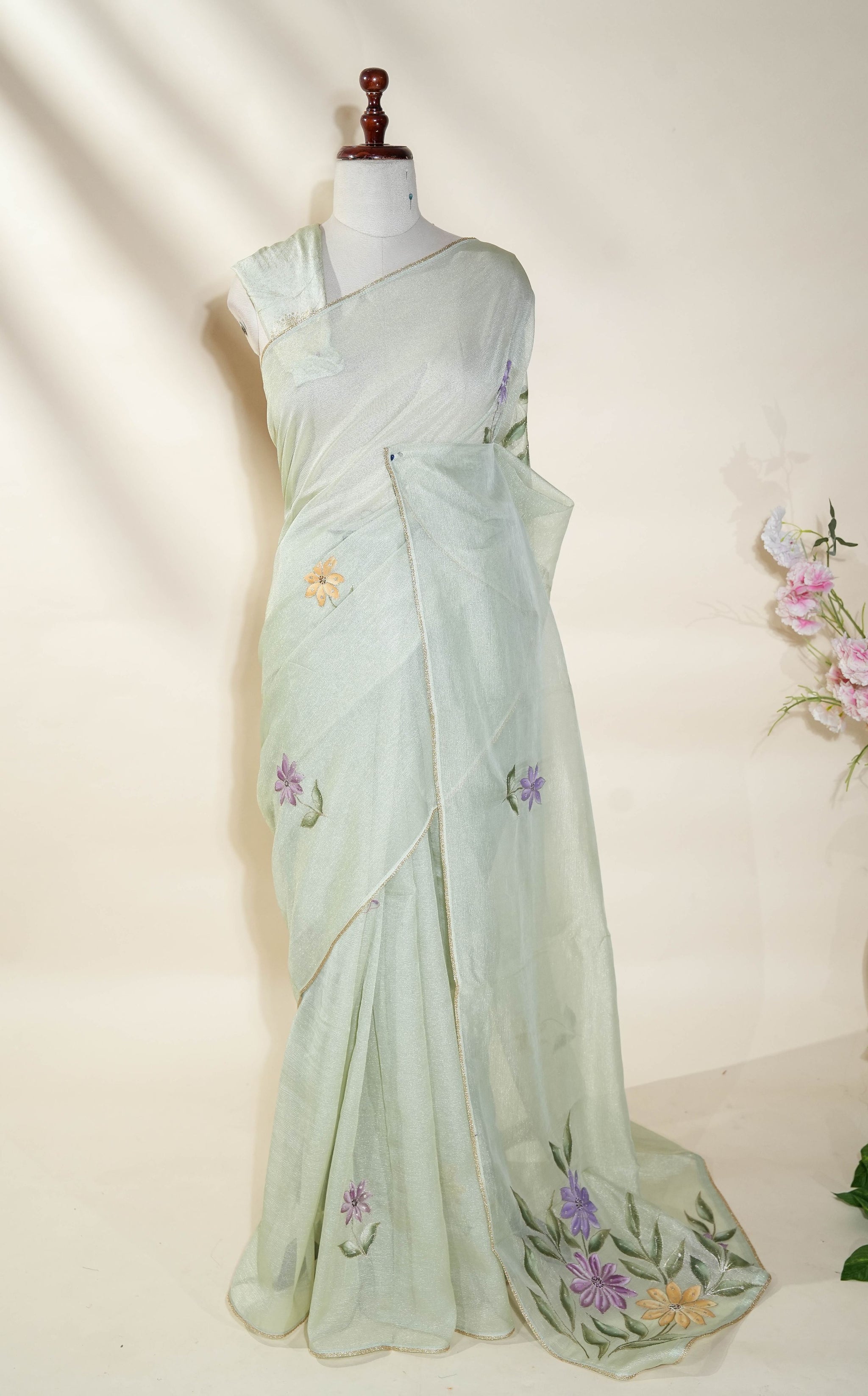 Elevate your ethnic wardrobe with this Pastel Printed Embroidery Tissue Saree. Crafted from lightweight tissue fabric, it offers a soft, graceful drape that enhances comfort throughout the day. The delicate pastel hues combined with intricate embroidery create a subtle yet sophisticated look, perfect for celebrations and formal occasions. Its breathable texture ensures you stay fresh, while the elegant design reflects timeless charm. Choose this saree to make a refined statement with effortless style.