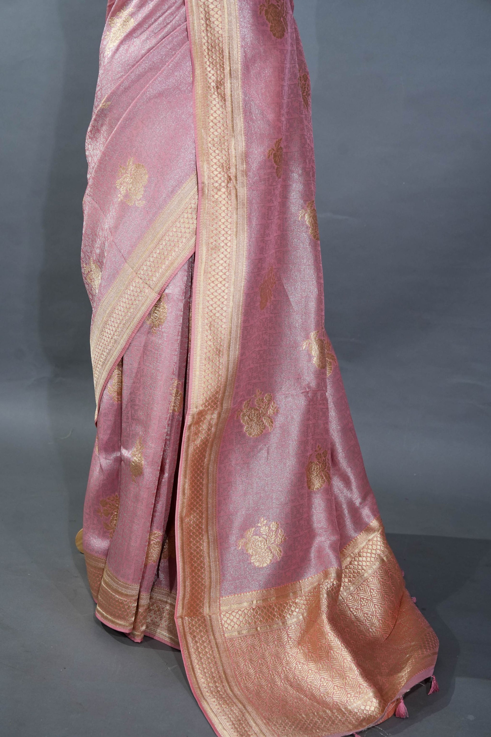 Elevate your traditional wardrobe with this Pink Banarasi Tissue Saree, showcasing exquisite craftsmanship and a delicate sheen. The lightweight tissue fabric offers comfort and grace, while the intricate Banarasi motifs add timeless elegance. Perfect for festive occasions or special celebrations, this saree ensures you stand out with its rich texture and captivating hue. Experience tradition refined with modern ease.
