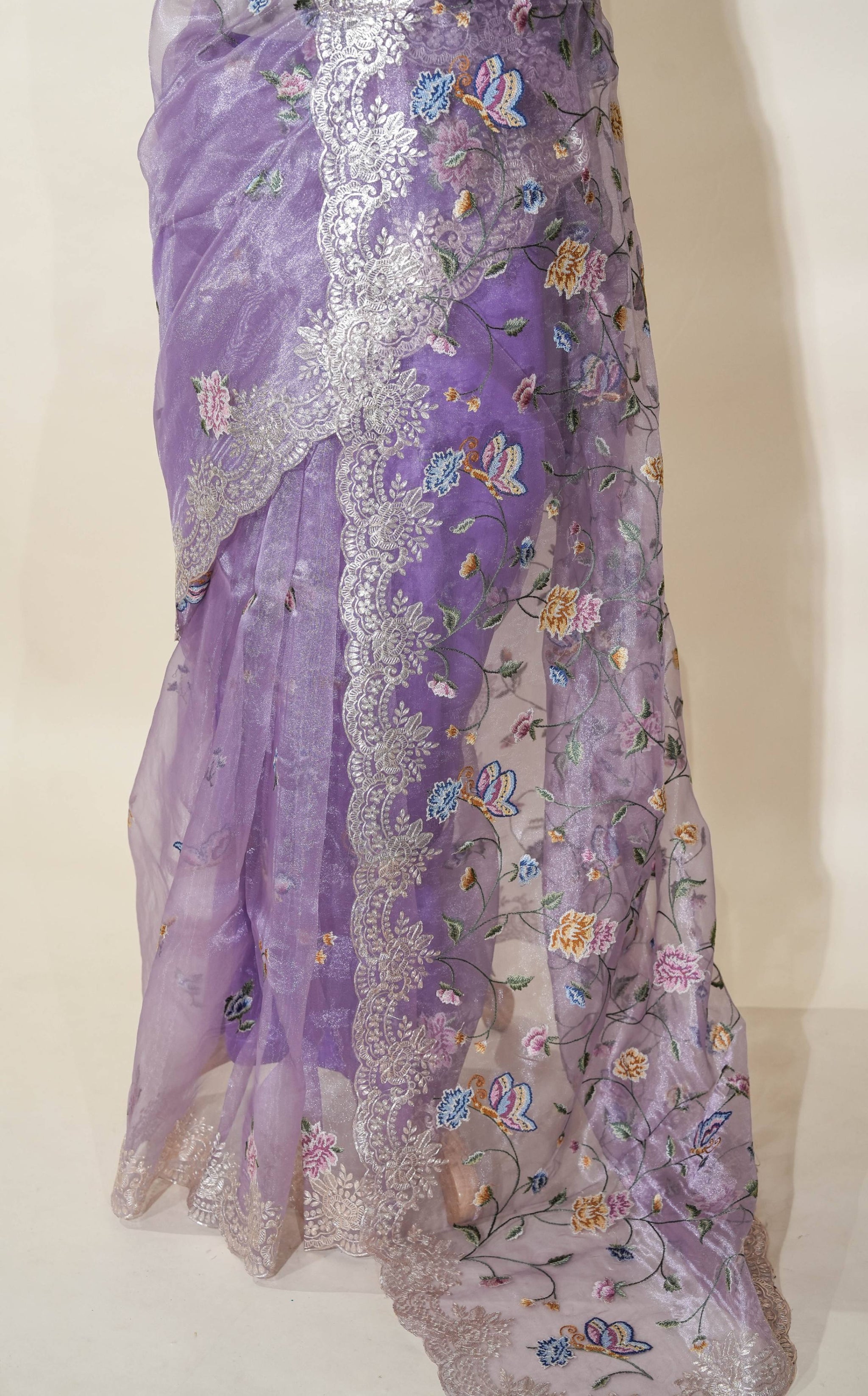 Elevate your style with this Purple Embroidery Tissue Saree, where delicate craftsmanship meets luxurious texture. The lightweight tissue fabric ensures comfort and grace, while intricate embroidery adds a touch of elegance perfect for festive occasions or formal gatherings. This saree effortlessly combines tradition with sophistication, making it a timeless addition to your wardrobe. Embrace its vibrant hue and detailed artistry to stand out with poise and charm.